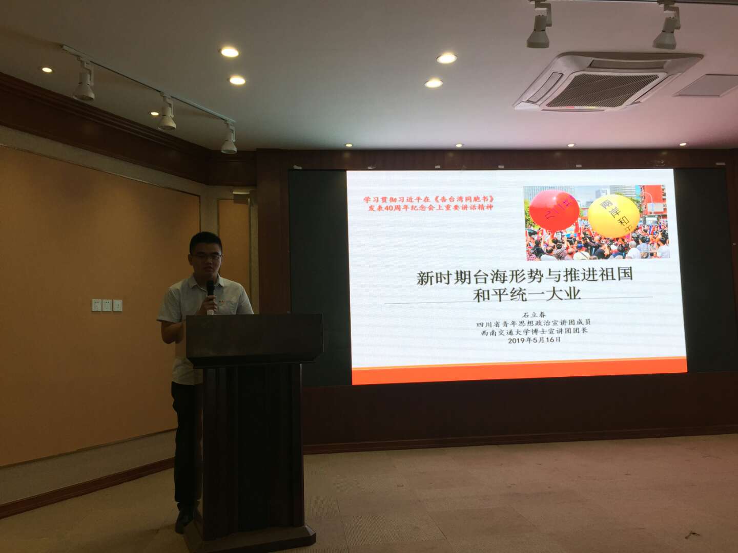 5月16日14:00-15:30,四川省青年思想政治宣讲团成员、校博士宣讲团团长,我院2015级博士研究生石立春,为高新区晨风社区党总支第十期“红色微讲坛”党课培训班学员,开展以“新时期台海形势与推进祖国和平统一大业”为题的政治宣讲。