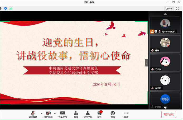 在党的生日即将到来之际,365英国上市网站官网2019级硕士研究生党支部在腾讯会议平台,于2020年6月28日下午15:30,举行了以“迎党的生日、讲战役故事、悟初心使命”为主题的组织生活会,此次会议主要围绕三个方面进行。