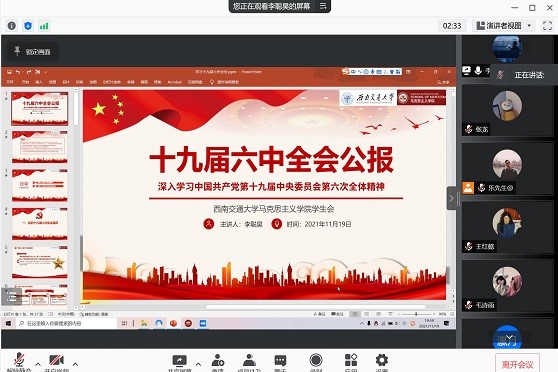 2021年11月19日晚8时,为深刻学习贯彻党的十九届六中全会精神,我院学生会以线上方式召开了“与信仰对话”——学习贯彻党的十九届六中全会精神专题学习会,会议由主席团成员李聪昊主持,学生会全体成员共同参加。