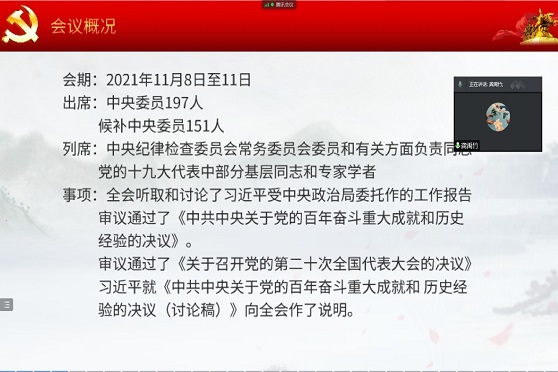 2018级本科团支部书记向大家简要介绍了全会概况,以及全会的四项主要议程事项:听取和讨论习近平受中央政治局委托作的工作报告、审议通过了《中共中央关于党的百年奋斗重大成就和历史经验的决议》、审议通过了《关于召开党的第二十次全国代表大会的决议》、习近平就《中共中央关于党的百年奋斗重大成就和历史经验的决议(讨论稿)》向全会作了说明。