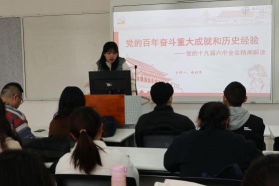 2021级硕士团支部以宣讲的形式,从制定《中共中央关于党的百年奋斗重大成就和历史经验的决议》的必要性、党的百年奋斗在实现中华民族伟大复兴进程中的科学定位、马克思主义中国化的新飞跃、把握百年奋斗历史意义的内在逻辑、深刻领会决议的十条历史经验五个方面,图文并茂、深入全面地学习十九届六中全会的内容与会议精神,引发众多同学的思考与启迪。