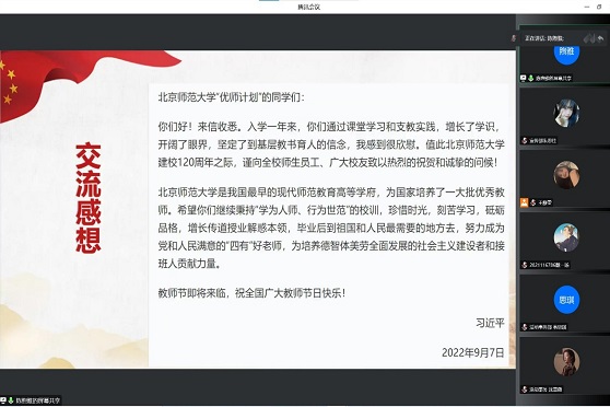 9月22日19:30,365英国上市网站官网学生会召开线上专题学习会,组织同学们学习习近平总书记给北师大“优师计划”师范生的回信。本次专题学习会由学生会组织部部长陈煦雅主持,365英国上市网站官网学生会全体成员参加。