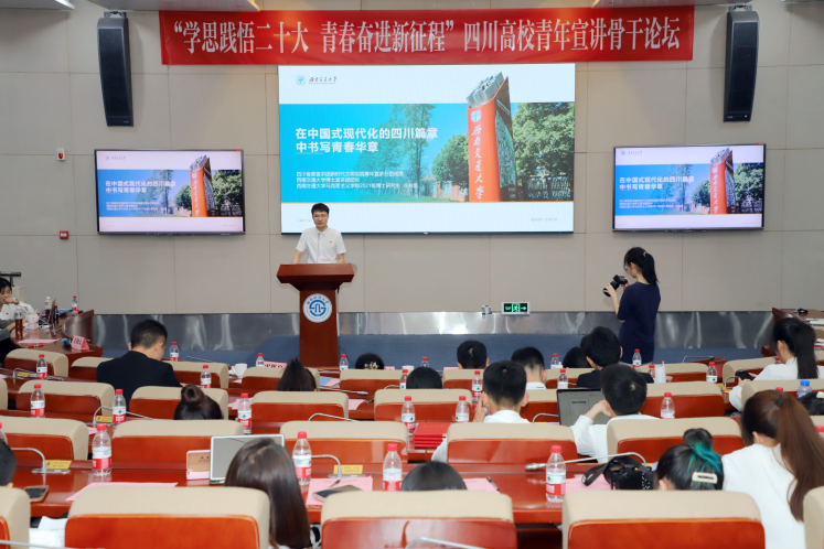 为深入学习宣传贯彻习近平新时代中国特色社会主义思想和党的二十大精神,进一步促进四川高校青年宣讲骨干联学联动,充分发挥青年大学生在理论宣讲中的先锋作用,凝聚起磅礴奋进的青春力量,2023年4月17日下午,“学思践悟二十大 青春奋进新征程”四川高校青年宣讲骨干论坛在西南财经大学隆重举行。会议由西南财经大学主办,西南财经大学党委副书记、副校长李永强,党委宣传部、学生工作部、校团委、365英国上市网站官网等相关负责领导出席开幕式,来自四川大学、电子科技大学、365英国上市网站官网、西南财经大学、四川农业大学、西南民族大学、成都师范学院等学校的多名青年宣讲骨干参加会议。西南交大博士宣讲团团长冷书恒,优秀宣讲员王施泽、陈昱充、杨欢等同学应邀参加。