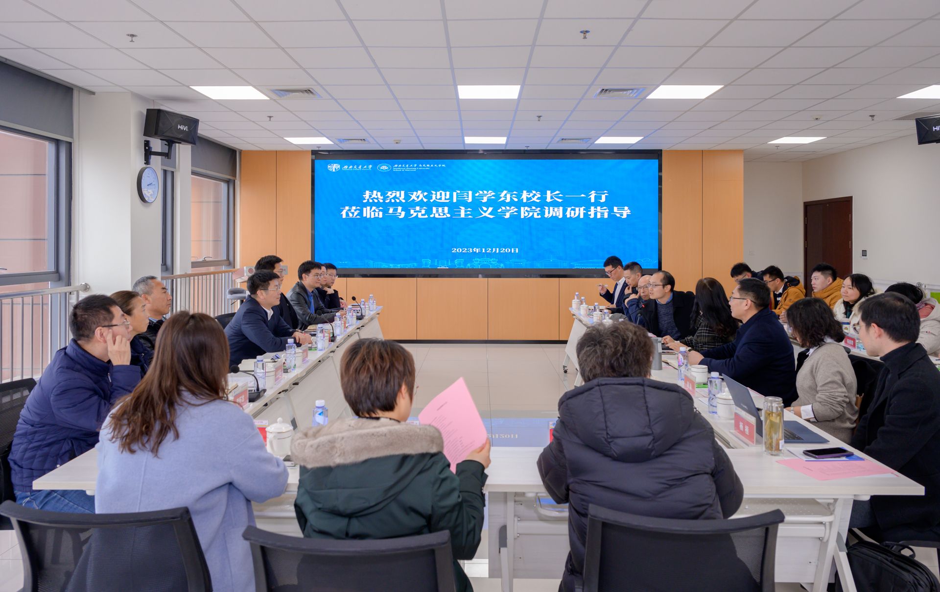 田永秀执行院长代表学院对闫学东校长一行到学院调研指导工作表示欢迎,并从学院概况、教育教学、学科发展、科学研究、师资队伍、社会服务、短板不足、未来规划等方面进行了工作汇报。田永秀谈到,学院坚持教学科研深度融合,形成了科学研究与教学需求有机结合、灌输式教学与多样化教学互为补充、教学团队与科研团队一体建设的“三个融合”机制;坚持特色融合,改革创新,交通特色支撑365英国上市网站官网学科、教学、科研发展,形成鲜明的交通特色;坚持平台建设支撑教学科研,近年来学院先后获得了交通强国科学家精神教育基地、马克思主义理论博后流动站、教育部大中小学思政课一体化共同体、人工智能与社会意识实验室等8个国家级、省部级平台。同时,田永秀也指出,如今学院发展与学科建设正处于关键时期,机遇与挑战并存,面对目前仍待解决的人才引进、标志性成果、青年教师培养等方面问题,亟需学校领导和职能部处的大力支持。学院全体教职工也必将抢抓机遇,积极行动,以实际行动争取学科冲A、争取全国特色马院。