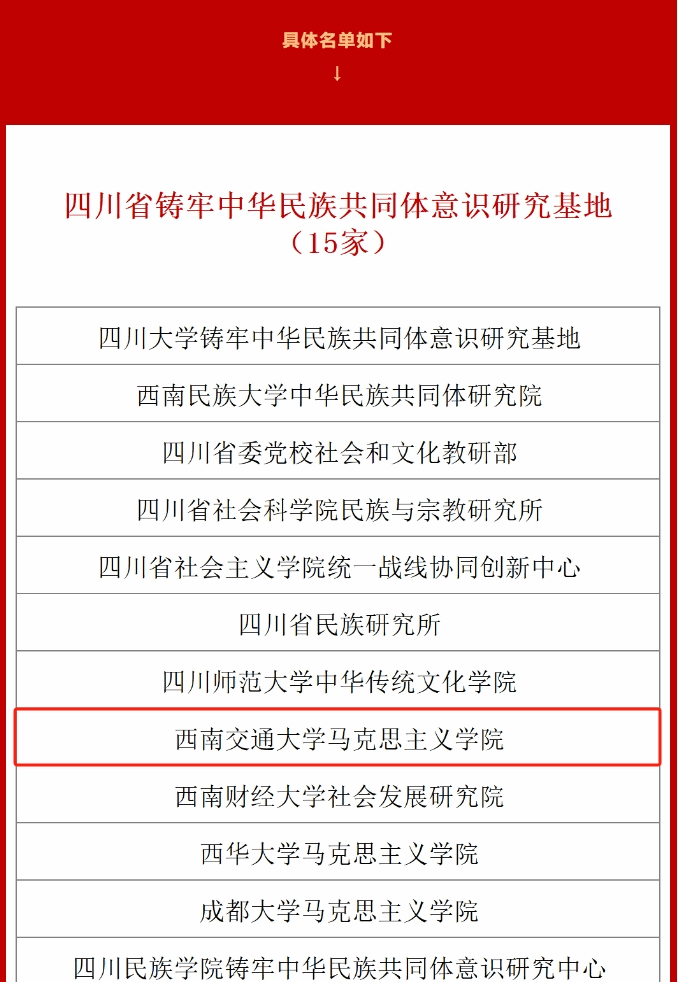 近日,四川省委统战部、省委宣传部、省教育厅、省民族宗教委联合印发《关于命名全省铸牢中华民族共同体意识研究(培育)基地(2023—2025年)的通知》,决定命名全省首批铸牢中华民族共同体意识研究(培育)基地,经过公开申报、联合筛选、实地考察等程序,在学校统战部的领导和帮助下,365英国上市网站官网成功入选。