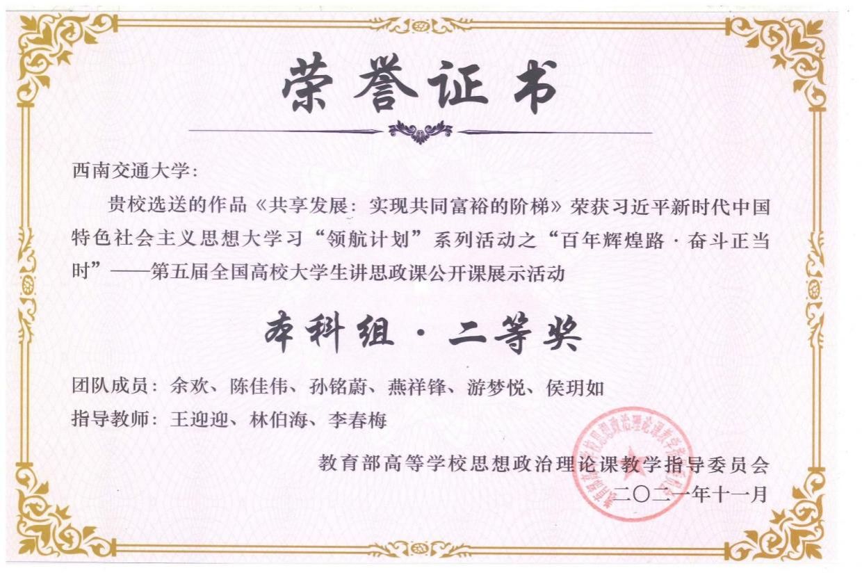 五年来,获批教育部高校示范365英国上市网站官网和优秀教学科研团队重点选题2项、全国高校思政课教学方法改革项目择优推广计划项目3项、四川省高等教育人才培养质量和教学改革重大项目3项、重点项目4项;获国家教学成果奖二等奖1项(参与)、四川省教学成果一等奖1项,二等奖1项、三等奖1项;中央电视台新闻联播、人民日报、光明日报、中国教育报、人民网、学习强国等多次报道学校思政课教学改革创新的做法、成效。