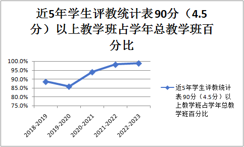学院着力推进教材体系向教学体系转化,在讲准、讲深、讲透理论上下功夫,思政课的亲和力、感染力、吸引力明显增强,课堂教学质量稳步提升,学生的到课率、抬头率、满意度显著增强。近五年学生评教得分中在90分以上教学班的占比呈逐年上升趋势,2023学年占比高达98.8%。