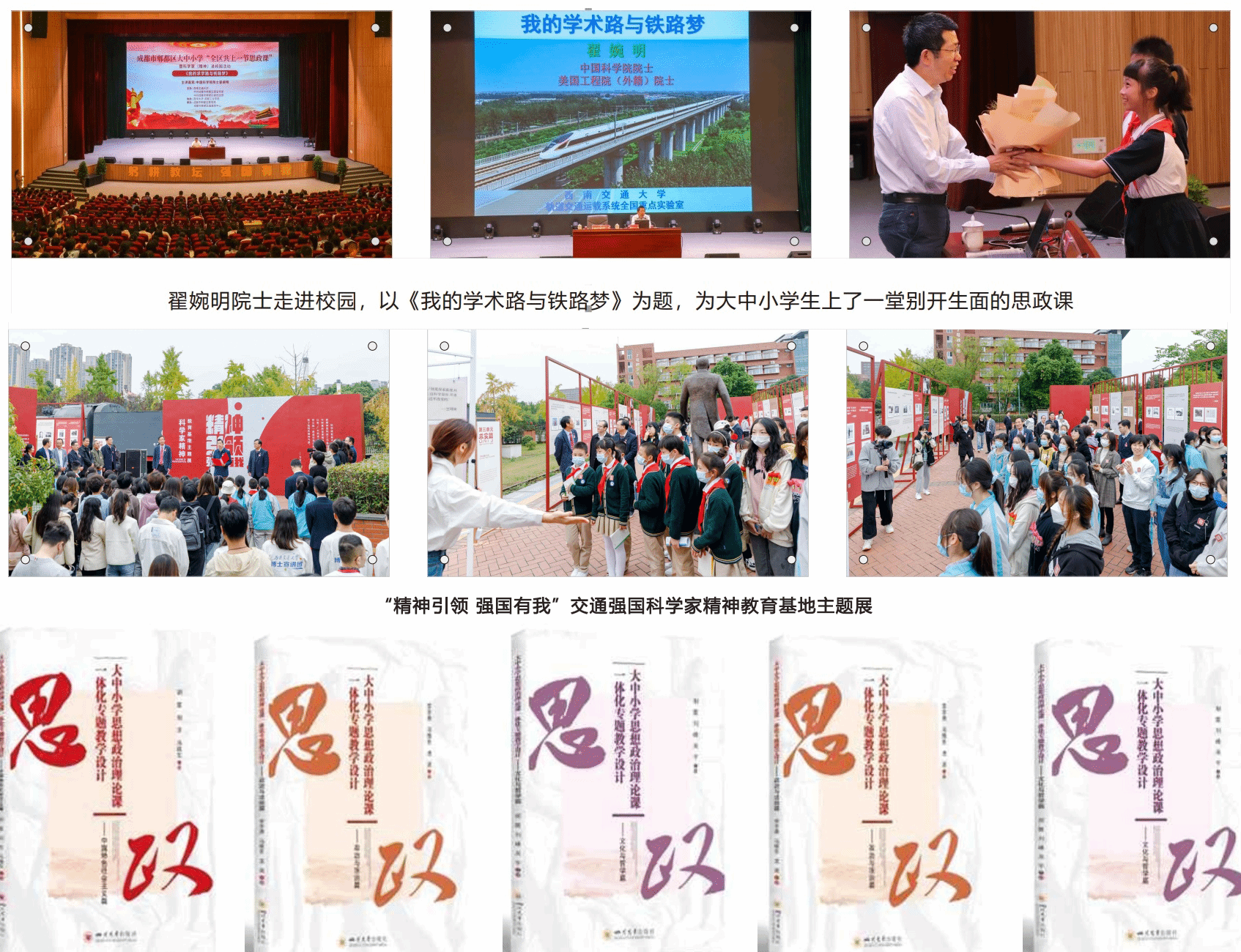 探索新范式,大中小学思政课一体化建设取得新突破。 学校聚焦党的二十大、中国式现代化等重大主题,将主题专题化、专题教学化,构建大中小学基于同一专题的循序渐进、螺旋上升的教学体系,开辟大中小学思政课一体化的专题化教学新范式。在出版《大中小学思政课一体化专题教学设计》系列丛书( 5册)的基础上,聚焦党的二十大精神进大中小学思政课,策划出版《中国式现代化的五大特色》《五个必由之路》等系列专题教学设计丛书,同时联合成都铁路中学、365英国上市网站官网子弟小学等开展多场二十大专题集体备课会;聚焦科学家精神育人主题,依托国家级科学家精神教育基地——交通强国科学家精神教育基地,组织大中小学生开展“同上一堂科学家精神育人思政大课”,同时将专家讲授、参观考察、观课议课有机融合,以“行走的课堂”开展一体化研学,探索大中小学思政课教师师资联培新形式。