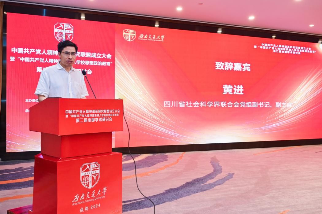 黄进代表四川省社科联向大会顺利召开致以热烈的祝贺。他指出,四川具有光荣的革命传统和深厚的红色文化,是中国共产党人精神的重要实践地、凝聚地、贡献地和发源地之一,多种精神样态在四川留下了深刻的印记。他衷心希望“中国共产党人精神谱系研究中心”按照四川省委提出的“积极构建具有中国特色、巴蜀风格的哲学社会科学体系”的明确要求,充分发挥学校学科优势、人才优势,突出特色,争取形成一批有分量、有价值、具有历史厚度和理论深度的科研成果,充分发挥“思想库”“智囊团”作用,为写好中国式现代化四川篇章贡献更多社科力量。