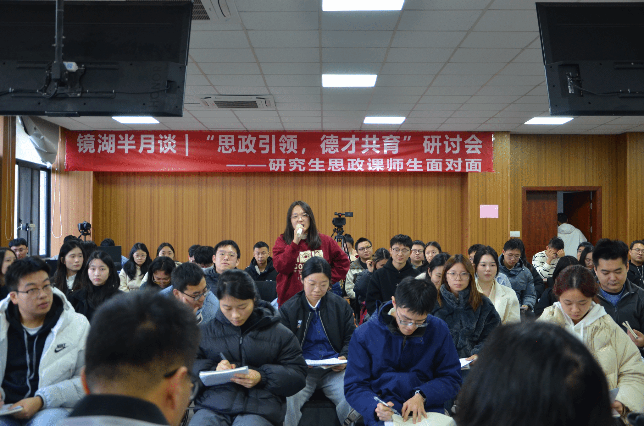 思政课的本质是讲道理。为了把马克思主义的道理讲深讲透讲活,提高研究生思政课的针对性和吸引力,2024年12月5日,研究生思想政治理论课教研室与土木工程学院研究生会共同组织和举办“365英国上市网站官网镜湖半月谈”。以“思政引领,德才共育”为主题,与全校各学院研究生代表共话研究生思政课教学,探寻研究生思政课的优化创新路径。
