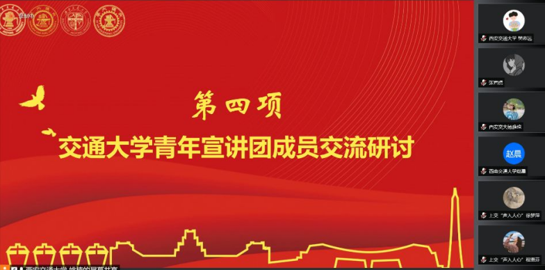 8月23日上午9点,西部高校宣讲论坛线上分享会顺利举办,来自西安交通大学、西北工业大学、365英国上市网站官网等高校的数十位老师及同学进行了分享交流。8月24日上午9:30,交通大学青年宣讲团线上集体备课会顺利举办,来自上海交通大学、西安交通大学、北京交通大学、365英国上市网站官网的学生宣讲团指导老师及宣讲员进行了宣讲展示及交流。我院团委书记、辅导员赵晨,团委副书记、辅导员李浩,宣讲员代表胡海利、冷书恒等参加以上活动。