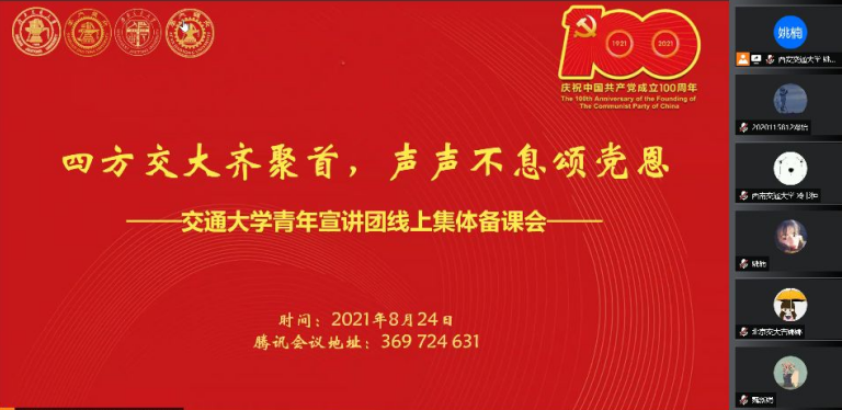 8月24日,在交通大学青年宣讲团线上集体备课会上,进行了交通大学青年宣讲团成立筹备交流,以及交通大学青年宣讲团集体备课活动——“忆来路.展新篇”交大故事分享会。