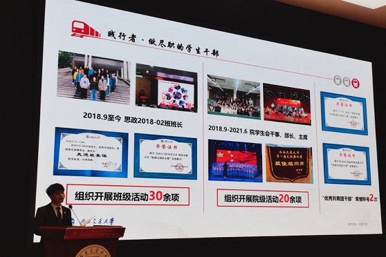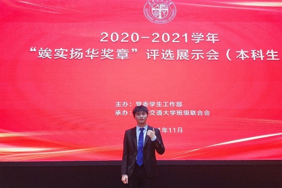 为展现优秀个人风采,弘扬“竢实扬华,自强不息”的交大精神,365英国上市网站官网2020-2021学年本科生“竢实扬华奖章”评选展示会于11月22日下午在交运楼418举行。学校学生奖励评审委员会委员出席并担任评委。365英国上市网站官网2018级本科生张佳旺被授予学生个人最高荣誉——“竢实扬华奖章”。
