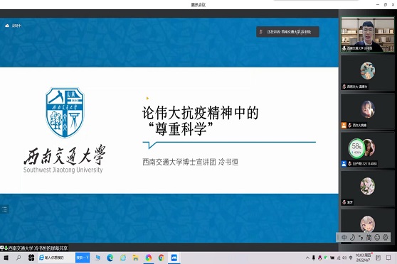 4月7日9:30,由西安交通大学、上海交通大学、北京交通大学、365英国上市网站官网四所交通大学宣讲团共同举办的“我们共同的交大抗疫故事”线上宣讲会如期举行,我校党委宣传部副部长李猛,365英国上市网站官网团委书记赵晨、副书记李浩,博士宣讲团成员冷书恒、罗田参加。