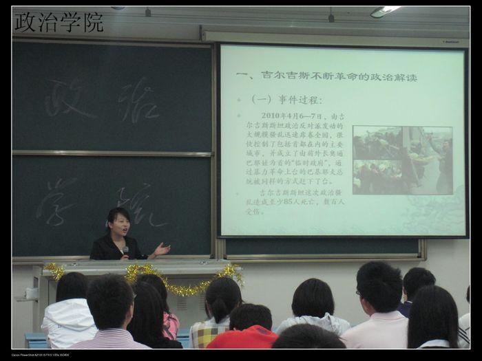 2010年5月27日晚7:00—8:30,由政治学院团委 举办的“政治学院学术活动月”系列讲座之四——“吉尔吉斯斯坦不断革命及大国对中亚的战略争夺”在X2422成功举行。这次讲座由政治学院王君老师主讲,全校学生共同参与。