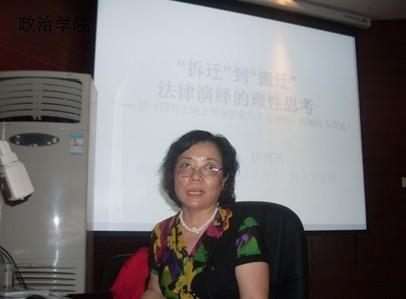 5月27日晚7:30政治学院在犀浦校区人文综合实验中心模拟法庭举办了一场由西南政法大学博士生导师唐烈英教授主讲的题为“‘拆迁’到‘搬迁’法律演绎的理性思考”的学术讲座。讲座由政治学院法学系学科带头人饶艾教授全程主持,系主任邓大鸣教授等教师和众多研究生与本科生共同出席并聆听了唐教授精彩的学术演讲。