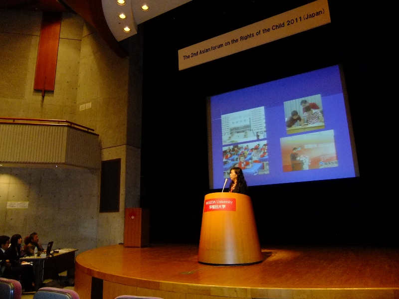 2011年11月19日-22日,第2届“亚洲儿童的权利论坛” 在日本东京早稻田大学国际会议厅举行,我校政治学院田雪梅副教授受邀参与,并在21日的大会上做了“四川大地震中的儿童支援”的报告,向与会各国人士翔实生动地向世界宣传了我国政府和社会在震后及灾后重建中关于儿童的支援政策、支援成效及未来目标。该论坛由联合国儿童基金会下属的“儿童权利公约综合研究所” 发起,首次大会2009年在韩国首尔召开,今年为第二次,主题是“创造适合于儿童成长的世界——危机状况下儿童权利的实现”。参加国家除中日韩三国外,还有印度、马来西亚、印度尼西亚、泰国、蒙古、越南、柬埔寨等其他亚洲国家以及中国台湾地区的相关学者、政府官员和民间儿童机构的负责人。出席该论坛的中方学者共两人。与会人士围绕“防止针对孩子的暴力”、“灾害时刻的儿童支援体系”、“儿童权利的保障机制的建构”发表了演讲和报告,会议最后通过了“为亚洲孩子更加美好的未来”大会宣言。