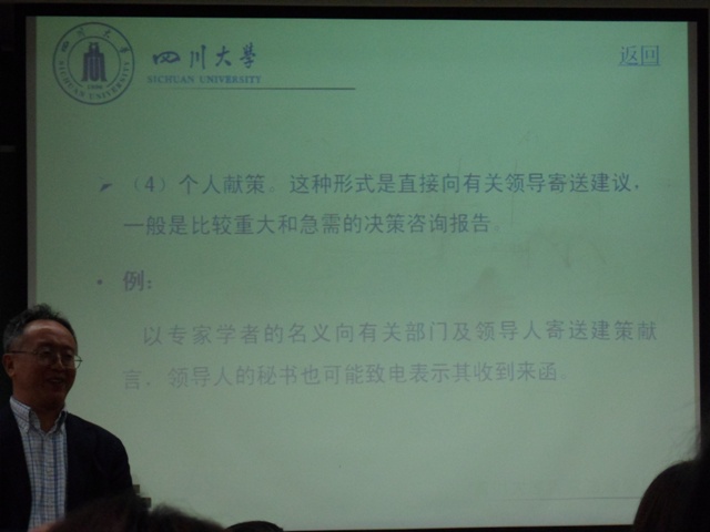2012年4月12日下午三点整,政治学院的师生在4323教室欢聚一堂,一起聆听了由四川大学法学院教授,博士生导师周伟教授所做的“建言献策的写作方法及其路径”的讲座。此次讲座,由我院院长林伯海教授担任主持。