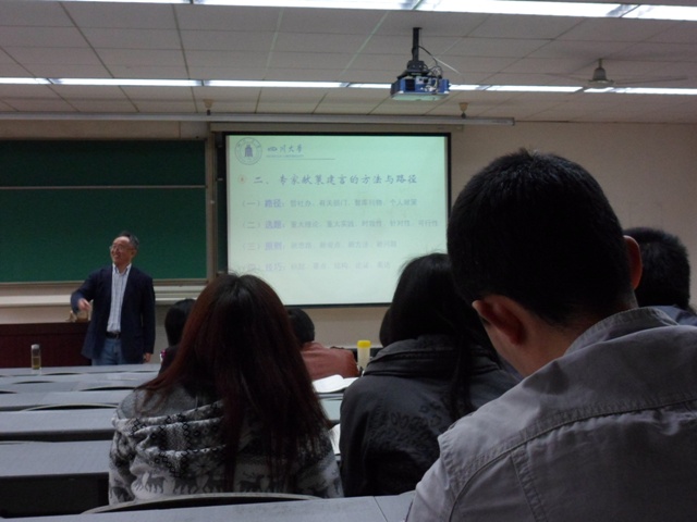 讲座开始前,周伟教授诙谐地说:“法律系的同学听了我的讲座对从事公务员职业很有好处,听了我的讲座你们就会写简报,这是与其他公务员最大的区别。”之后他的讲座主要从以下三方面着手:(一)决策科学中的专业方法;(二)专家建言献策的方法与路径;(三)决策咨询报告的原则。