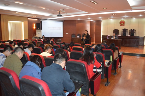 饶艾教授首先为各位讲解了本次讲座的选题意义,随后又介绍了会议的一些主要内容和精神,提出全面推进依法治国的主题。她认为,十八届四中全会主要意义有三点:一是中国法制现代化的新征程;二是新中国法制建设的里程碑;三是依法治国方略的升级版。接下来又向大家展示了十八届四中全会的重要精神,明确阐释了中国特色社会主义法制体系总目标:必须坚持走中国特色社会主义法制道路,建设中国特色社会主义的法治体系。在坚持全面推进依法治国目标的同时,我们也必须坚持基本原则,例如党的领导地位、人民的主体地位等。在总目标的指引下概括出法治建设的四大要务:以宪法为中心的中国特色社会主义体系,加强宪法实施;深入推进依法行政,加快建设法治政府;保证公正司法,提高司法公信力;增强全民法治观念,推进法制社会建设。饶教授在讲座的最后也提出了自己对于全面推进依法治国的几点保障措施。