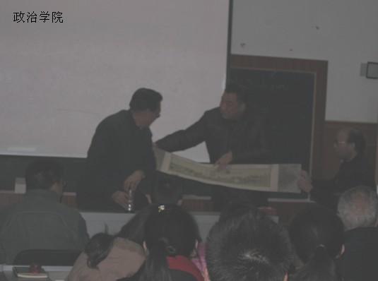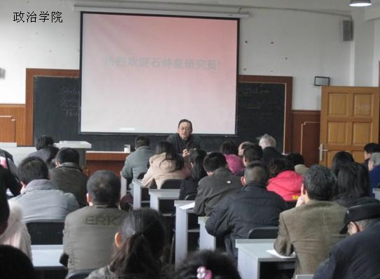 2009年11月24日,九里3439室,中共党史学专家、研究员、毛泽东思想邓小平理论研究会会长石仲泉同志,为我院师生作“关于马克思主义中国化与建国60周年”报告。报告由林伯海教授主持。石仲泉研究员为师生们分析了毛泽东思想与邓小平理论、“三个代表”重要思想、科学发展观的关系,并指出毛泽东思想在当代仍具有重要意义,它是我党先进思想的源泉。此次报告会为同学们解答了众多理论问题,同学们均反映收益颇多。最后,校党委副书记、政治学院院长何云庵教授代表我院向石仲泉研究员赠送了精美礼品。