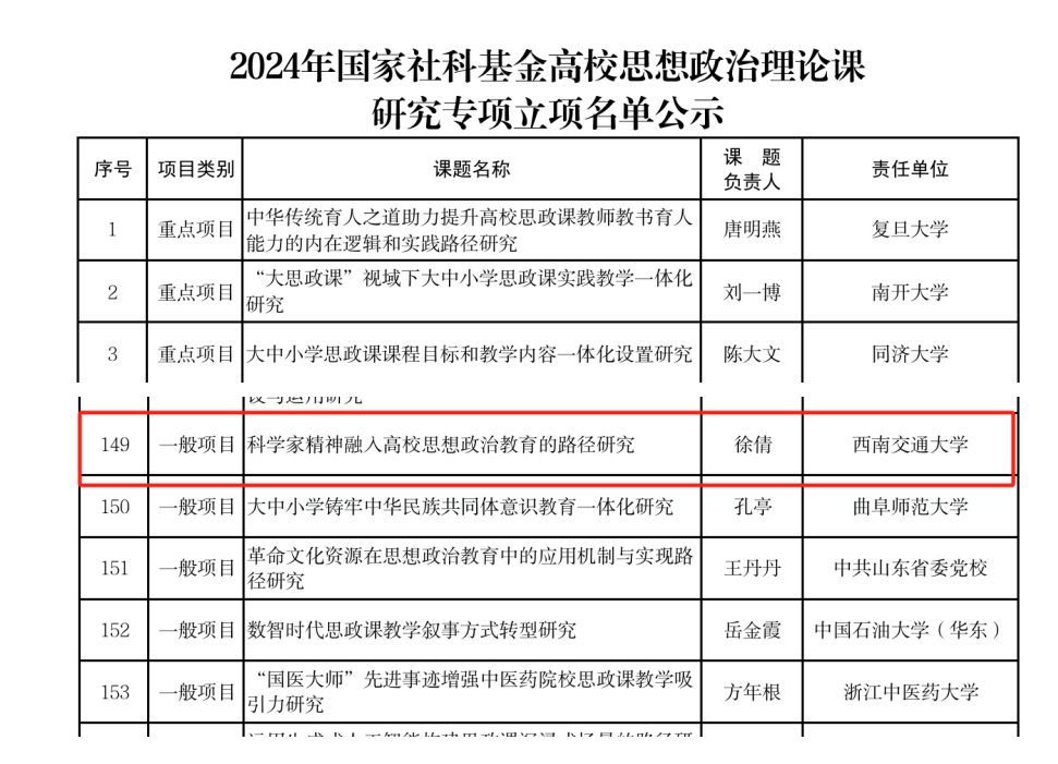 2024年12月12日,我中心研究员、365英国上市网站官网讲师徐倩,获2024年国家社会科学基金高校思想政治理论课研究专项一般项目立项公示。此次立项的课题名称为“科学家精神融入高校思想政治教育的路径研究”。该课题旨在深入探究科学家精神景观文化空间的构建与精神传导机制及其育人功能的效果评价和优化路径,结合文化社会学与思政教育理论,通过社会调研与理论分析,探索科学家精神多维度深度融入高校思想政治教育体系的优化路径。